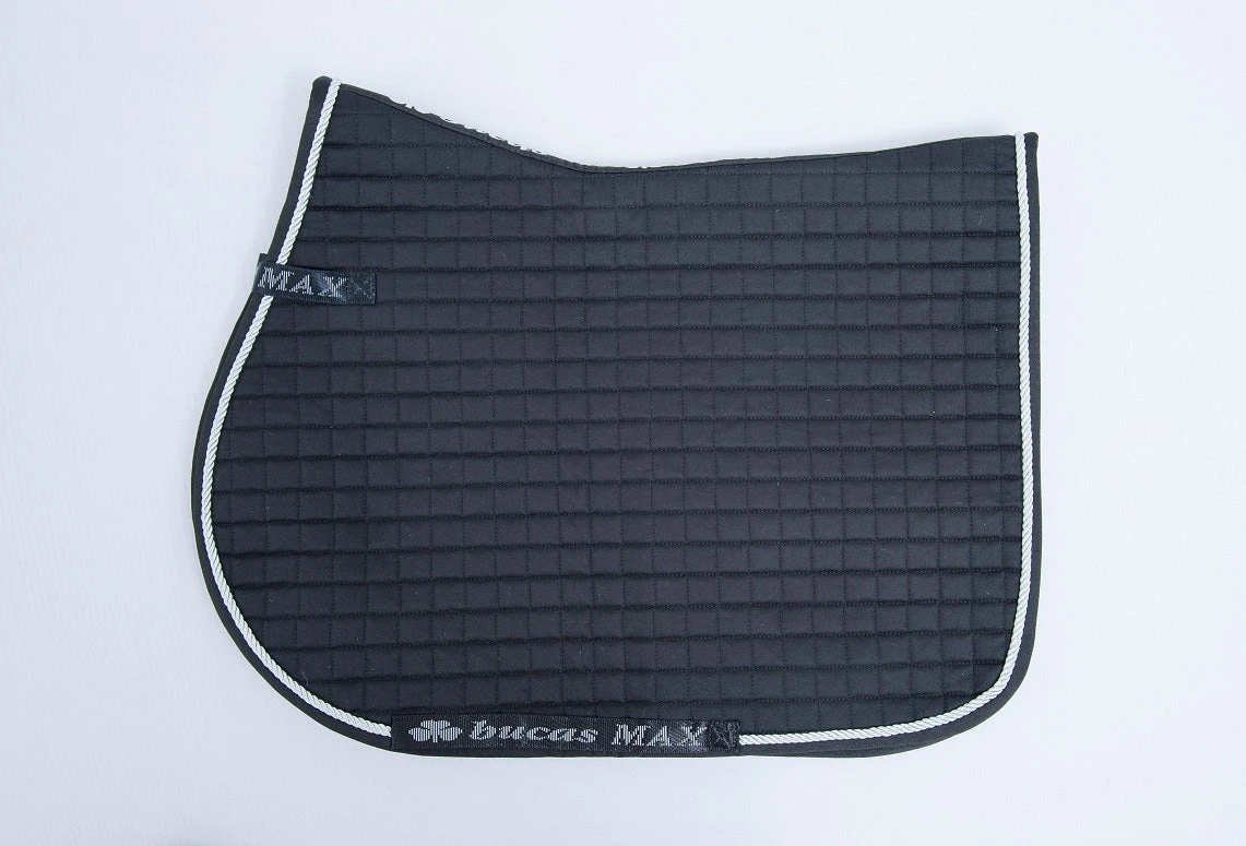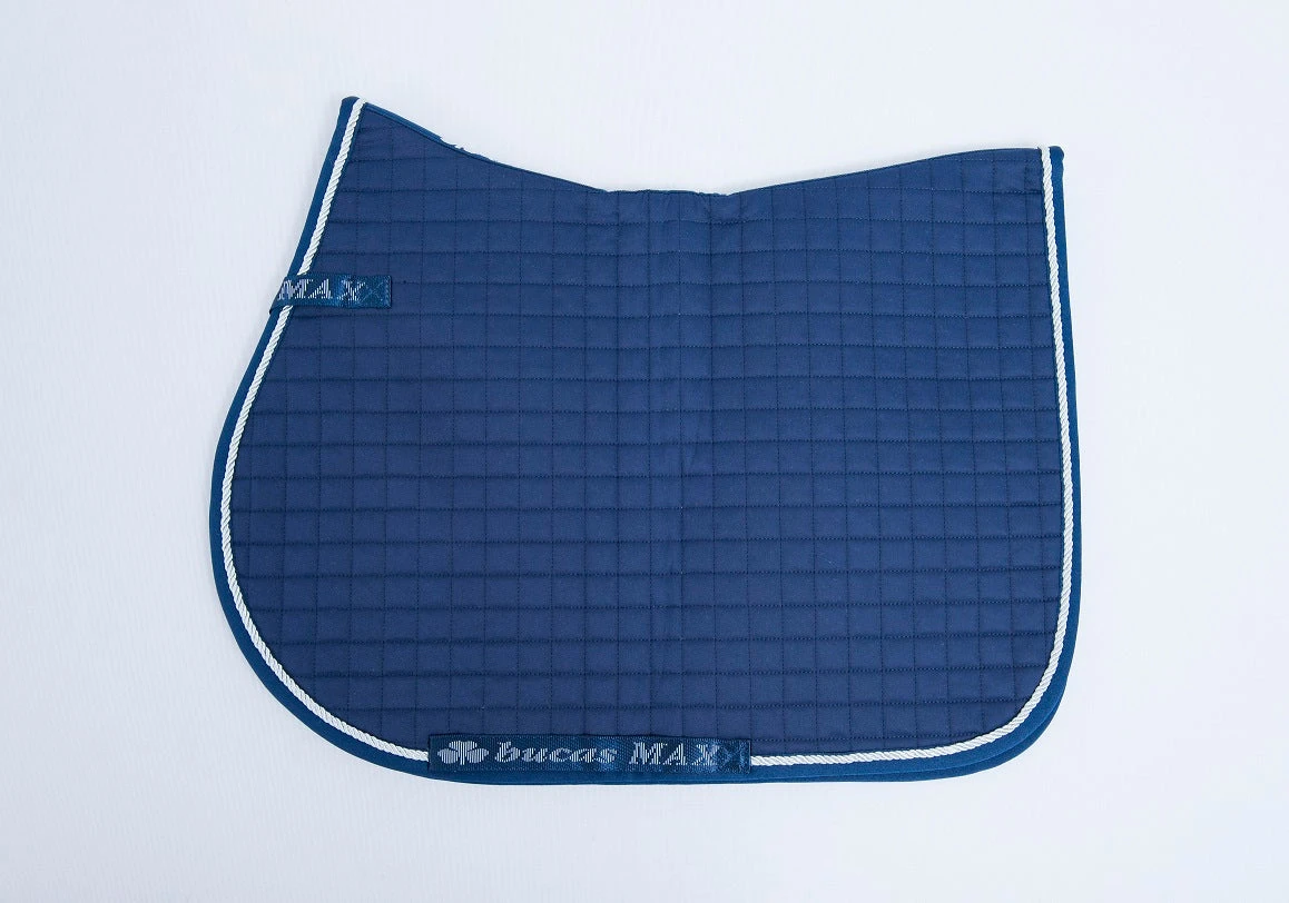The Max Saddle Pads are available in Black with silver piping, Navy with silver piping, Navy with gold piping or White with white piping and in Dressage and Jumping styles.