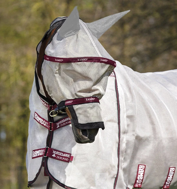 The Rambo Flymask Plus is Horseware’s most effective and durable flymask. The mask has a large dome for the best eye protection, soft fitting ears and a detachable nose. The mask is edged with fleece to prevent rubbing.