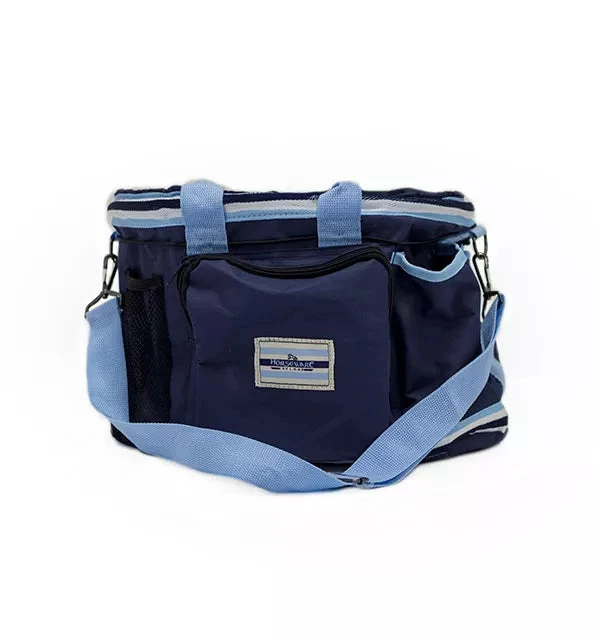 Grooming bag; sweat scraper; face brush; body brush; dandy brush; mane and tail brush; hoof pick; curry comb.