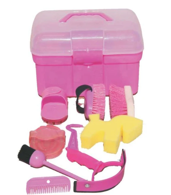 9 Piece Grooming Box Grooming Kit includes 2 Brushes, 2 Currys, Hoofpick, Sponge, Shedding blade, hoof brush and Mane comb.