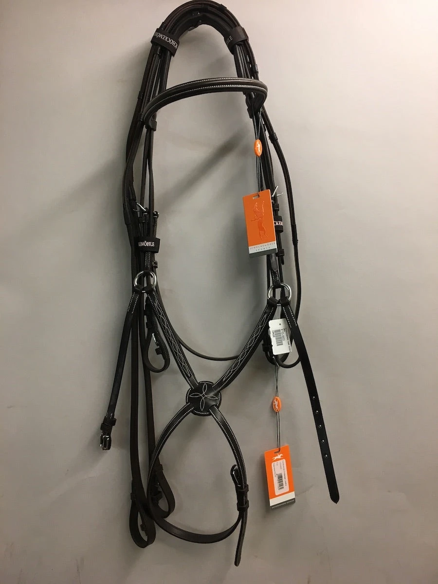 The Schockemohle Dan Diego is a figure-8 jumper bridle with fancy stitching, padded and anatomical head.