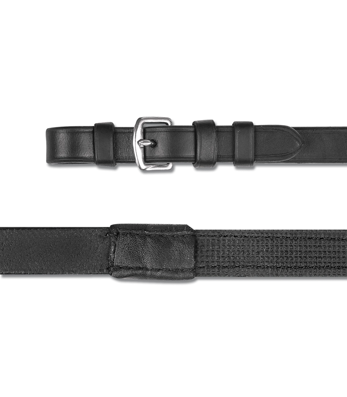 Smooth leather reins on the one side while the other side is coated with rubber.